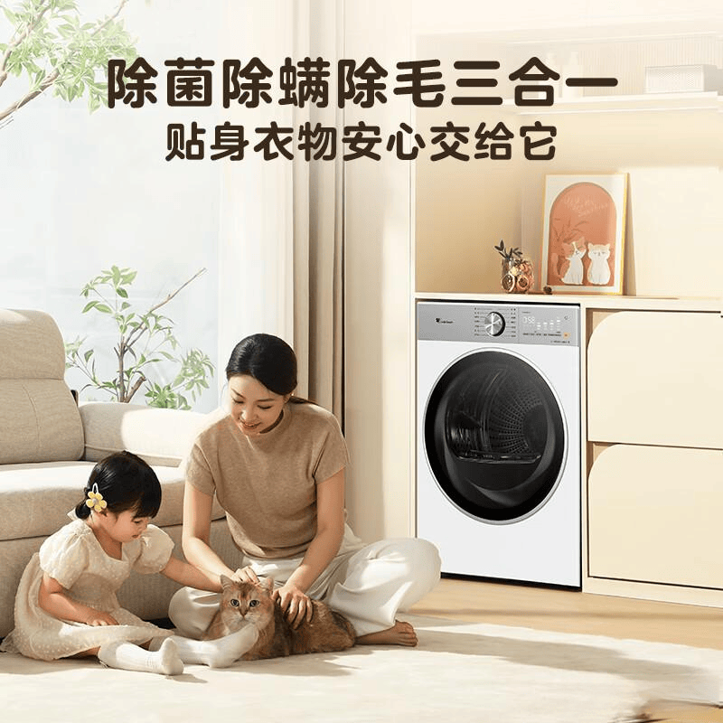 在功能方面,五重毛屑过滤系统能够深入去除衣物上的毛屑和粉尘,很适合有宠物的家庭。多维除菌功能和UV紫外线杀菌作用显著,能有效消灭99.9%的细菌,呵护全家健康。搭配温度传感器实时监控,确保烘干温度约42°C,既保护衣料,又保证干得均匀。